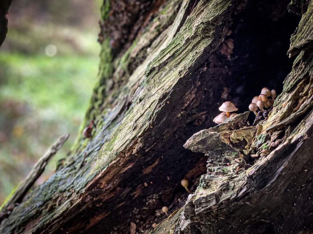 Tiny and delicate against the coarseness of an aged hardwood. Sprouting silently among the scent of decay, never to be found unless they were sought out.